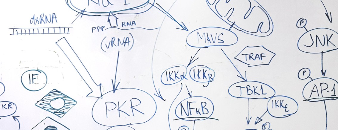 Many viruses evolved countermeasures that prevent translation arrest and SG formation. Interestingly, SG inhibition is often blocked by viruses even when global translation arrest is induced, suggesting that in addition to being the indicators of global translation arrest, SGs themselves may have antiviral functions. Characterizing the functional role of SG formation in innate immune responses is one of our research objectives.